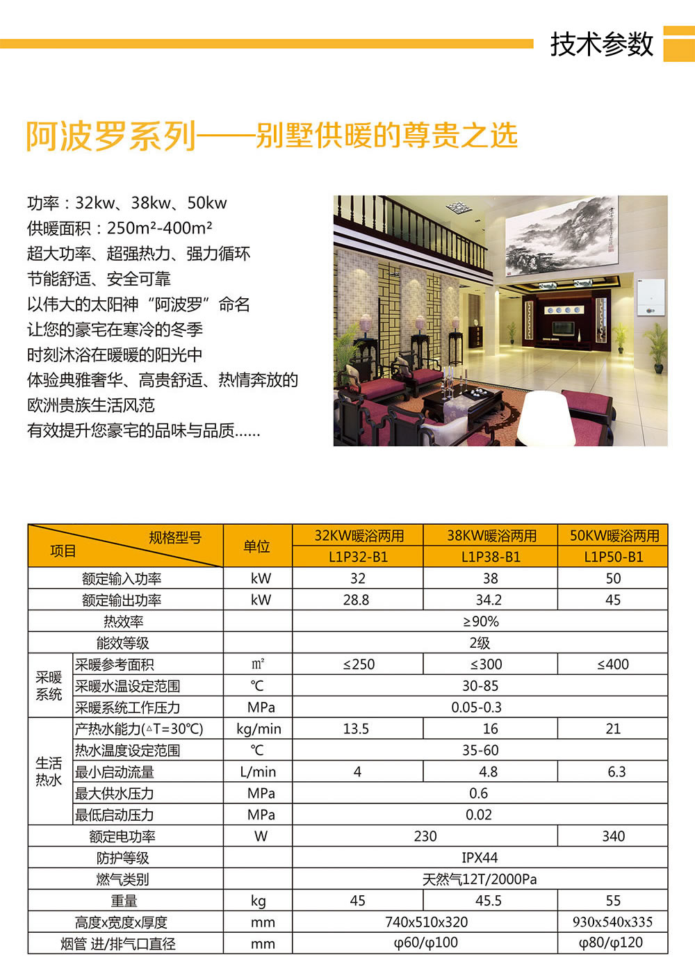 功率:36kw、40kw、50kw 供暖面積:260m2-400m2 超大功率、超強熱力、強力循環 節能舒適、安全可靠 以偉大的太陽神“阿波羅”命名 讓您的豪宅在寒冷的冬季 時刻沐浴在暖暖的陽光中 體驗典雅奢華、高貴舒適、熱情奔放的 歐洲貴族生活風范 有效提升您豪宅的品味與品質..……