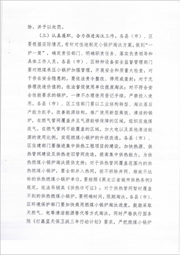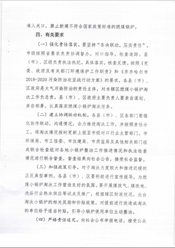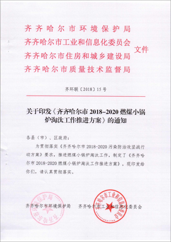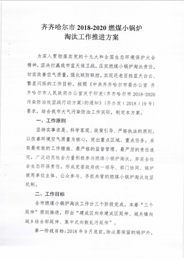 為貫徹落實《齊齊哈爾市2018-2020污染防治攻堅戰行動方案》要求,推進燃煤小鍋爐淘汰工作,制定了《齊齊哈爾市2018-2020燃煤小鍋爐淘汰工作推進方案》,現印發給你們,請認真貫徹落實。