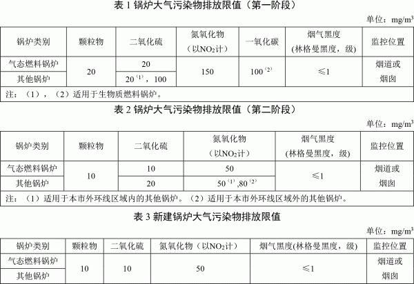 上海市地方污染物排放標準《鍋爐大氣污染物排放標準》已經上海市人民政府同意,現予以發布。 標準編號及名稱為:鍋爐大氣污染物排放標準 DB31/387-2018 該標準自2018年6月7日起實施。 附件:《鍋爐大氣污染物排放標準》 上海市環境保護局 上海市質量技術監督局 2018年6月7日 鍋爐大氣污染物排放標準 上海市地方標準(DB31/387—2018) 1適用范圍 本標準規定了鍋爐大氣污染物排放控制要求,監測以及標準的實施與監督等內容。 本標準適用于上海市范圍內鍋爐大氣污染物的排放管理,以及新建、改建、擴建項目的環境影響評價、環境保護設施設計、竣工環境保護驗收、排污許可證核發及其投產后的大氣污染物排放管理。 本標準適用于單臺出力65t/h以下的蒸汽鍋爐、熱水鍋爐及有機熱載體鍋爐。使用醇醚燃料(如甲醇、乙醇、二甲醚等)的鍋爐參照本標準中氣態燃料鍋爐執行。 本標準不適用于以生活垃圾、危險廢物以及其他非危險廢物為燃料的鍋爐。 本標準適用于法律允許的污染物排放行為。新設立污染源的選址和特殊保護區域內現有污染源的管理,按照《中華人民共和國大氣污染防治法》、《中國人民共和國環境影響評價法》、《上海市環境保護條例》、《上海市大氣污染防治條例》等法律、法規、規章的相關規定執行。 2規范性引用文件 下列文件中的條款通過本標準的引用而成為本標準的條款。凡是不注日期的引用文件,其最 新版本適用于本標準。 GB 5468鍋爐煙塵測試方法 GB 13271鍋爐大氣污染物排放標準 GB/T 16157固定污染源排氣中顆粒物測定與氣態污染物采樣方法 HJ/T 42固定污染源排氣中氮氧化物的測定紫外分光光度法 HJ/T 43固定污染源排氣中氮氧化物的測定鹽酸萘乙二胺分光光度法 HJ/T 44固定污染源排氣中一氧化碳的測定非色散紅外吸收法 HJ/T 56固定污染源排氣中二氧化硫的測定碘量法 HJ 57固定污染源排氣中二氧化硫的測定定電位電解法 HJ 75固定污染源煙氣(SO2、NOx、顆粒物)排放連續監測技術規范 HJ 76固定污染源煙氣(SO2、NOx、顆粒物)排放連續監測系統技術要求及檢測方法 HJ/T 373固定污染源監測質量保證與質量控制技術規范(試行) HJ/T 397固定源廢氣監測技術規范 HJ/T 398固定污染源排放煙氣黑度的測定林格曼煙氣黑度圖法 HJ 629固定污染源廢氣二氧化硫的測定非分散紅外吸收法 HJ 692固定污染源廢氣氮氧化物的測定非分散紅外吸收法 HJ 693固定污染源廢氣氮氧化物的測定定電位電解法 HJ 819排污單位自行監測技術指南總則 HJ 836固定污染源廢氣低濃度顆粒物的測定重量法 《污染源自動監控管理辦法》(國家環境保護總局令第28號) 《環境監測管理辦法》(國家環境保護總局令第39號) 3術語和定義 下列術語和定義適用于本標準。 3.1 鍋爐boiler 指利用燃料燃燒釋放的熱能或其他來源的熱能,將水或其他工質(如有機熱載體等)加熱以生產規定參數(溫度,壓力)和品質的蒸汽、熱水或其他工質的設備,用于工業生產和/或民用。 鍋爐的額定出力(產熱量)一般以兩種單位來表示,即熱功率和蒸發量。熱功率的單位為 MW(兆瓦),蒸發量的單位為t/h(噸/時)。其換算關系為0.7MW相當于1t/h。 3.2 氣態燃料gaseous fuel 天然氣、焦爐煤氣、高爐煤氣等燃燒時物理狀態為氣態的燃料。 3.3 標準狀態standard condition 指溫度在273K,壓力在101325Pa時的氣體狀態,簡稱“標態”。本標準規定的排放濃度均指標準狀態下的干煙氣中的數值。 3.4 氧含量O2 content 燃料燃燒后,煙氣中含有的多余的自由氧,通常以干基容積百分數來表示。 3.5 煙囪高度stack height 從煙囪(或鍋爐房)所在地平面至煙囪出口的高度。 3.6 新建鍋爐和在用鍋爐new and in-use boiler 新建鍋爐:本標準實施之日起,環境影響評價文件通過審批的新建、改建、擴建的鍋爐建設項目。在用鍋爐:本標準實施之日前,已建成投產或環境影響評價文件已通過審批的鍋爐。 4大氣污染物排放控制要求 4.1大氣污染物排放限值 4.1.1自本標準實施之日起至2020年9月30日,在用鍋爐執行表1規定的排放限值。自2020年10月1日起,在用鍋爐(生物質燃料鍋爐除外)執行表2規定的排放限值。自2020年10月1日起,在用生物質燃料鍋爐執行表1規定的排放限值。 4.1.2自本標準實施之日起,新建鍋爐(生物質燃料鍋爐除外)執行表3規定的排放限值。自本標準實施之日起,新建生物質燃料鍋爐執行表1規定的排放限值。