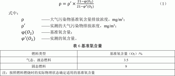 5.5大氣污染物基準含氧量排放濃度折算方法 實測鍋爐顆粒物、二氧化硫、氮氧化物、一氧化碳的排放濃度,應按GB/T 16157或GB 5468規定,采用表6規定的基準氧含量按照公式(1)折算為基準氧含量排放濃度。 折算公式如下: