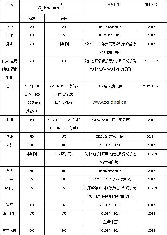 全國認真貫徹執行《鍋爐大氣污染物排放標準》的同時。各地陸續出臺了更加嚴格的鍋爐污染物排放地方標準。其中,作為PM2.5的重要前體物,氮氧化物成為大氣污染治理的重中之重,為了進一步減少氮氧化物排放,改善空氣質量,地方對氮氧化物排放更為嚴格。各地燃氣鍋爐氮氧化物排放規定如下。