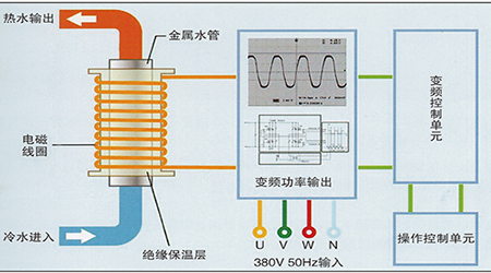 變頻電磁蒸汽(熱水)鍋爐加熱核心部分采用筒狀水電分離結構。當正常的市電源進入設備后通過電磁加熱控制器輸出部分變頻為10KHz-20KHz的高頻感應電流。高頻感應電流通過纏繞在金屬體時,內部產生高頻磁場,利用磁力線切割的作用,繞在線圈的鐵管便生產渦流效應,生產焦耳熱。從而達到快速加熱的目的。加熱過程中熱水器中的水被充分磁化,不結垢,無需定期除垢大大增加了電磁采暖爐的使用壽命。